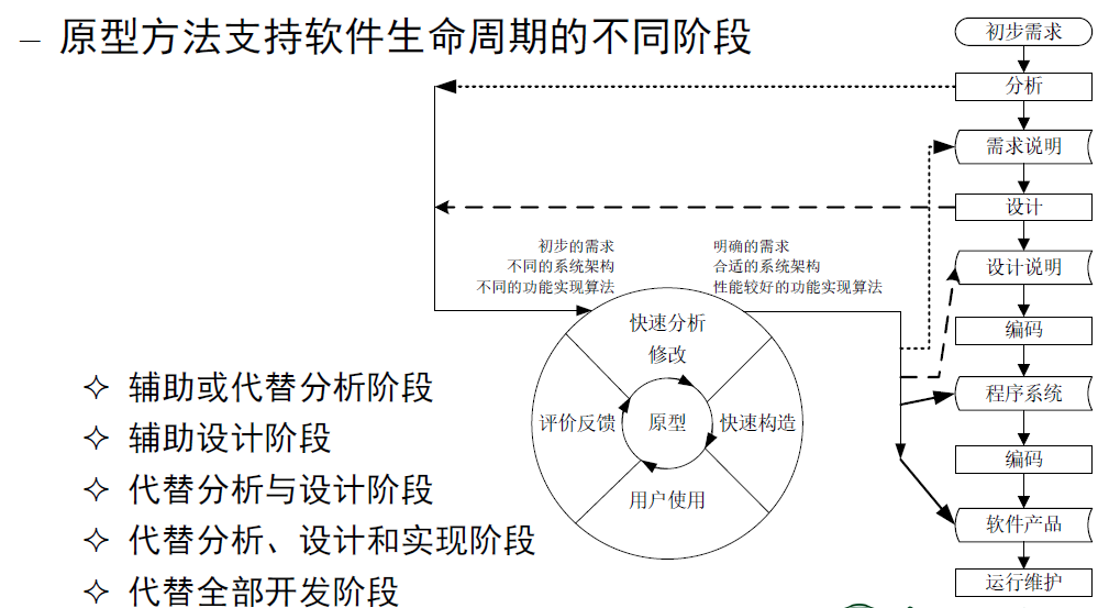 - 应用原型方法,代替分析、设计和实现阶段: